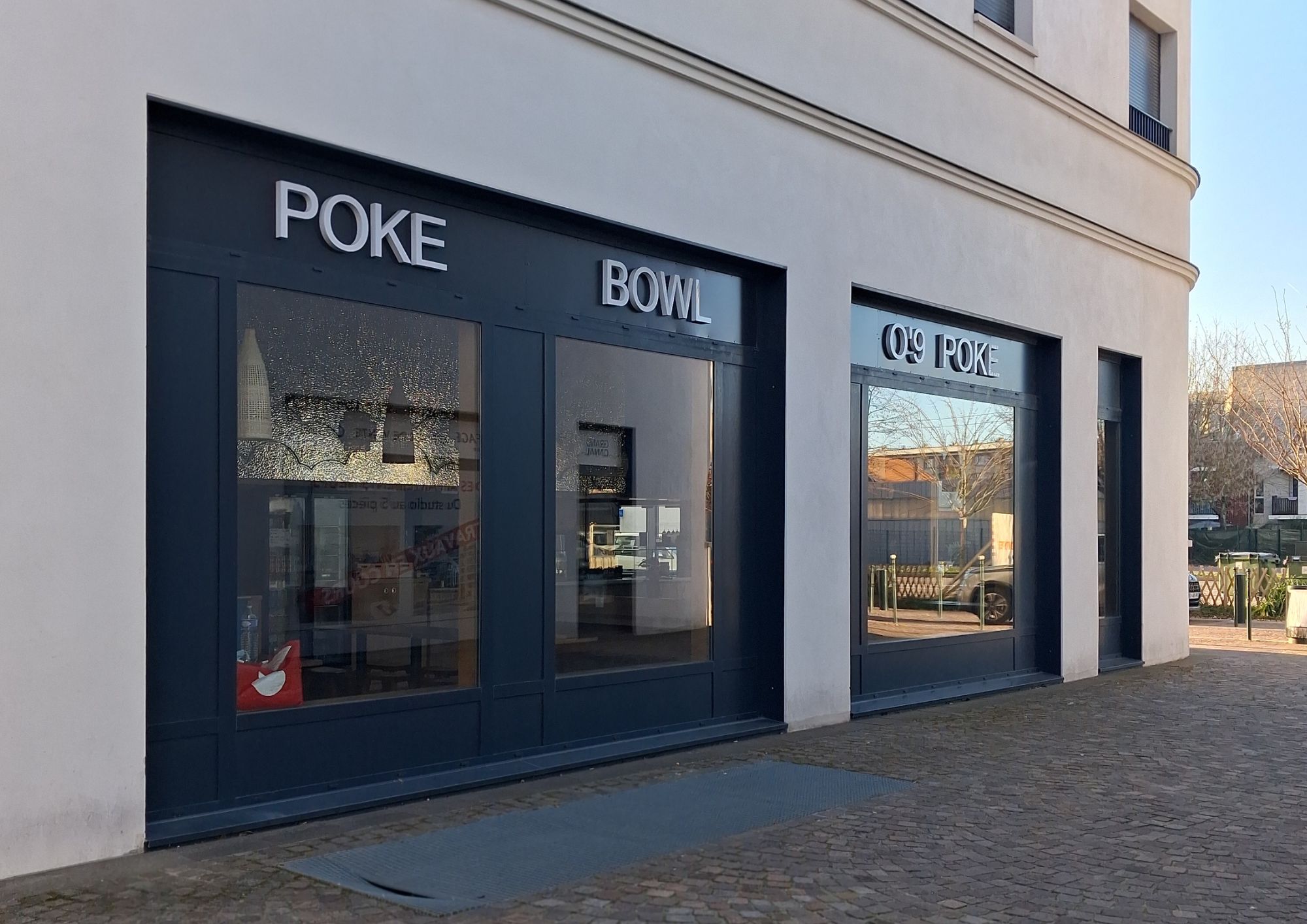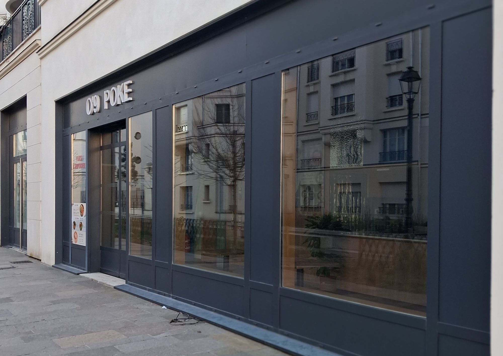 Local livré brut de béton, fluides en attente et vitrines posées.